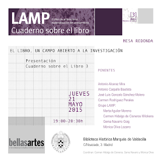 Con motivo de la presentación del cuarto número de la revista Cuaderno sobre el libro 03 del grupo de investigación Complutense LAMP, El libro de artista como materialización del pensamiento, se organiza la mesa redonda: El libro, un campo abierto a la investigación, en la Biblioteca Histórica Marqués de Valdecilla de Madrid, el 21 de mayo a las 19:00 horas. La puesta en común de las diferentes vías de estudio favorece el intercambio de experiencias e información. Se trata de tender lazos y propiciar la colaboración entre instituciones.